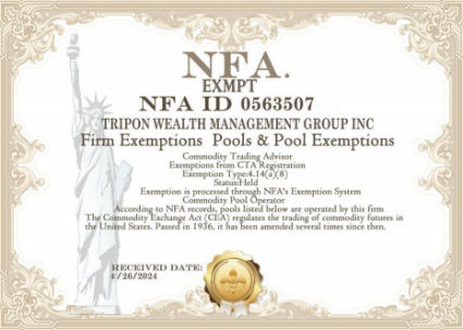 TRIPON was founded in 2023 and is headquartered in New York, USA. Although it has not been established for a long time, TRIPON has quickly emerged in the global wealth management field with its outstanding professional capabilities and innovative spirit. Since its establishment, the company has obtained a number of international compliance qualifications and licenses, including New York State compliance qualification, US NFA financial license, US MSB financial license, US Colorado compliance qualification, Singapore foundation license and British foundation license.